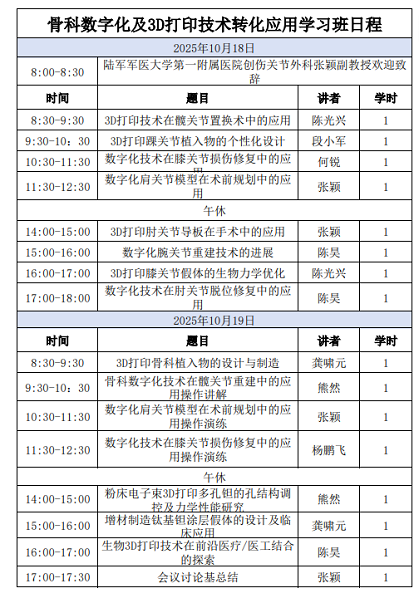 我司參與的國家重點(diǎn)研發(fā)計(jì)劃項(xiàng)目“個(gè)性化多孔鉭植入假體粉床電子束增材制造關(guān)鍵技術(shù)和臨床應(yīng)用”牽頭單位西南醫(yī)院關(guān)節(jié)外科定于2025年10月18-19日舉辦國家級(jí)繼續(xù)醫(yī)學(xué)教育項(xiàng)目“骨科數(shù)字化及3D打印技術(shù)轉(zhuǎn)化應(yīng)用學(xué)習(xí)班”。誠邀相關(guān)技術(shù)人員及業(yè)界同仁積極參加此次培訓(xùn)活動(dòng)。培訓(xùn)班具體安排如下: